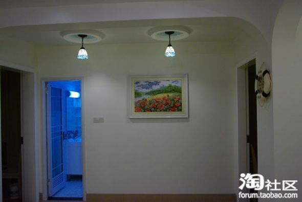 这个就是大家刚刚看看走廊圆圆的吊顶啦,现在变成这样啦,配上贝壳马赛克灯,很有感觉吧,墙上的是饼干妈妈朋友送的十字绣,非常的搭我们的小窝窝哦!中间是洗手间,左边的是主卧,右边的是次卧!