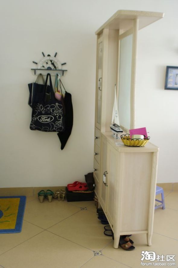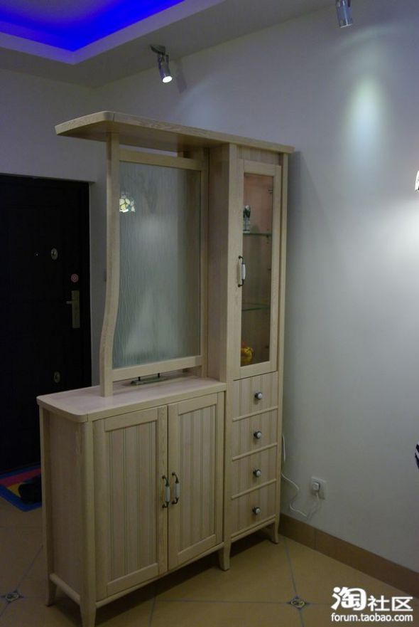 玄关的正面,哇,流口水啊!上面的玻璃柜放装饰品,下面的抽屉放杂物,右边的双门柜是放鞋子的,真的很方便哦!
