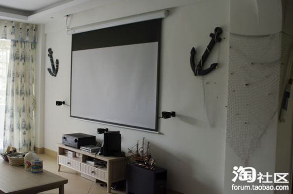 投影机是明基的,相框淘宝淘的,很喜欢哦,就是重量轻了点,说是松木的,和我们的客厅很塔哦!相框式馒头挂的,歪歪扭扭的!