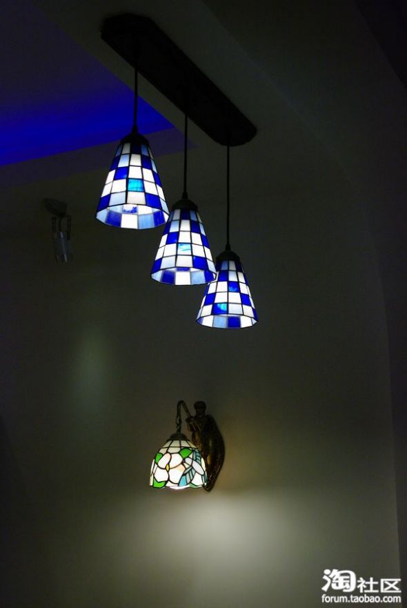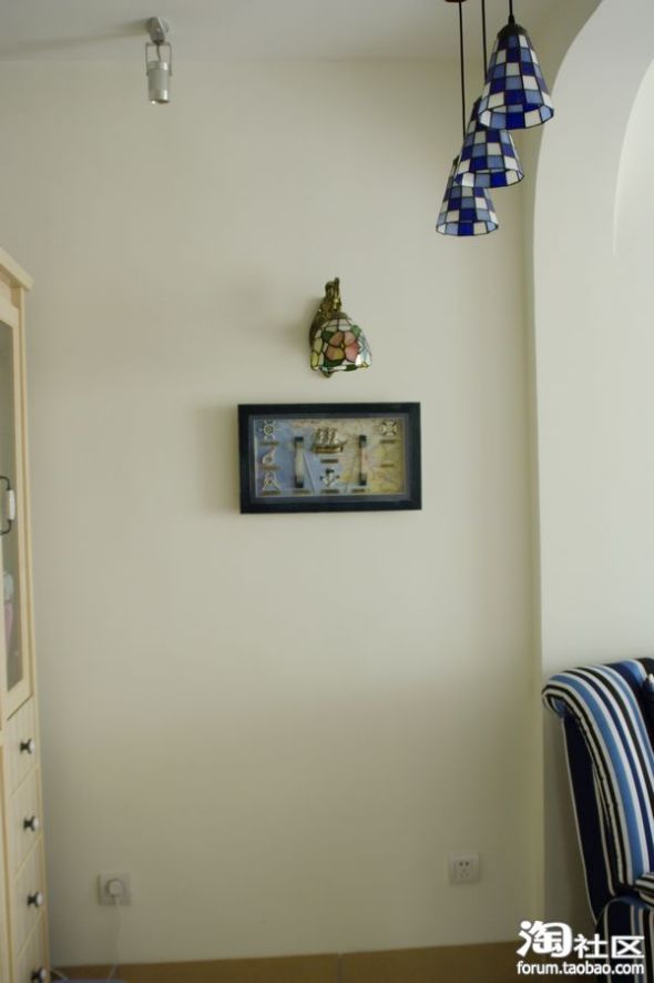这里是玄关和沙发之间的空隙,本来打算做个酒吧台,因为一些原因暂时没有实现,立体的地中海挂画和美人鱼挂灯!来自淘宝