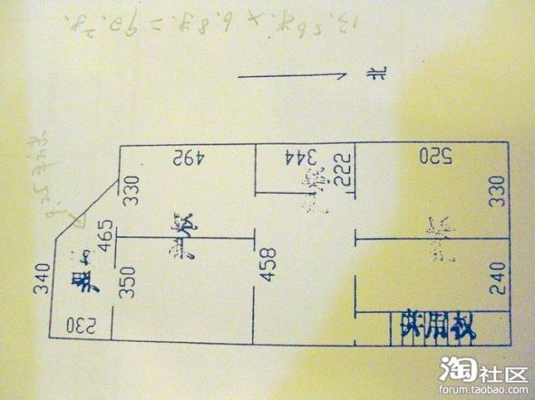 使用权是大门入口、240部分是厨房、330和520部分是次卧、222和344是洗手间、492和330是主卧、458和350这个部分是客厅、230和340和465部分是阳台。其实构造非常的简单。方方正正的房子是很好装修滴,由于房子里面真的太旧了,我们决定把里面全部打掉,最后只剩下一个框架了