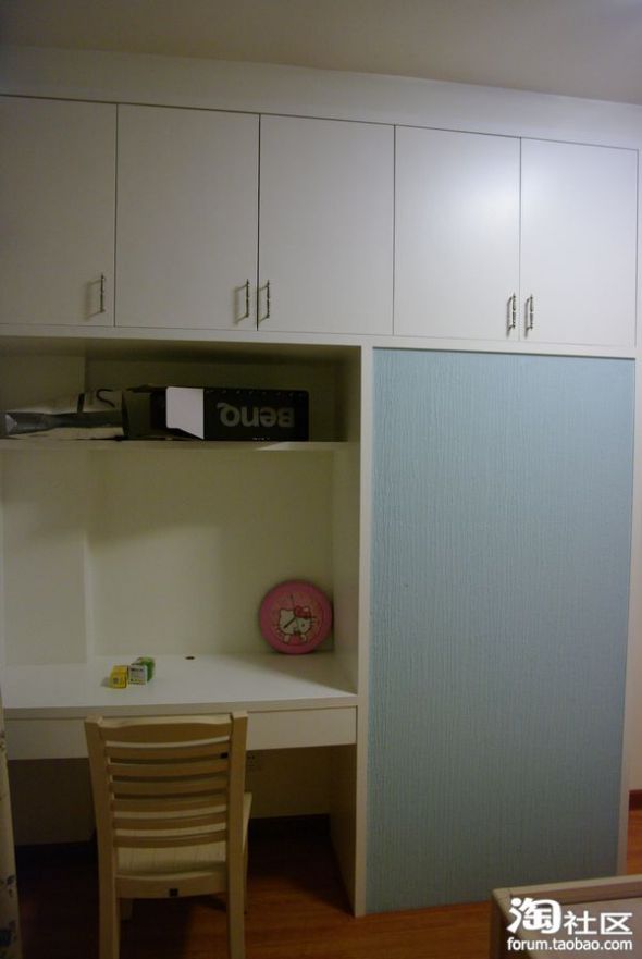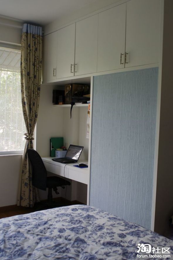 次卧的书桌和柜子已经装得差不多了,旁边那块白白的是不是很奇怪啊!很像柜子,但又没有门,到底是什么,馒头后面会附图说明哦!