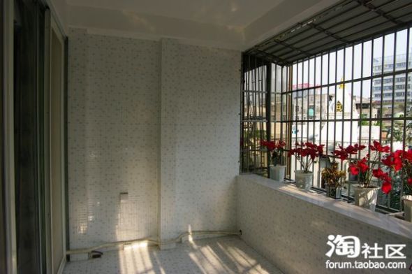 先来一张小地中海的阳台吧,照片有点色差,是蓝白的小方格,大家是不是以为是马赛克啊!都是马赛克我就穷咯!哈哈其实是一块一块的糖果瓷砖,实物颜色是很正的哦!