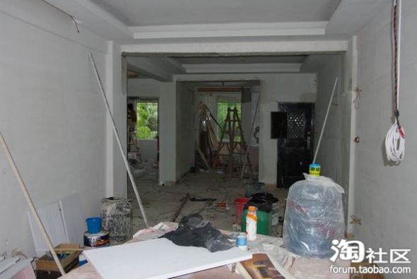 这个是站在阳台的角度拍客厅的位置,放A型梯的地方是厨房,我们做了敞开式的,这样起到宽敞和明亮的作用,挨着厨房的就是次卧啦,这个房子的特点之一是窗都很大哦!所以整个房子都很明亮,阴天也不用开灯的,师傅们在认真工作呢!