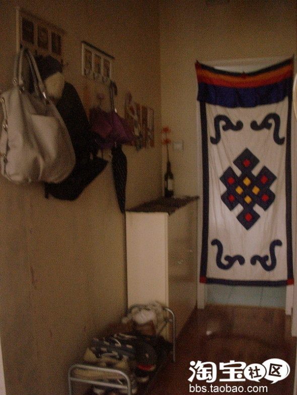 首先是玄关。其实这个没什么可说的,玄关不大,放了鞋柜。墙上贴了软木板,淘宝买的,8块只要40块钱。上面钉了很多小照片,留言贴什么的。有点乱。哈哈。门帘那边是厨房。厨房我就暂时先不贴了哈,里面太乱了。。不好意思放出来。