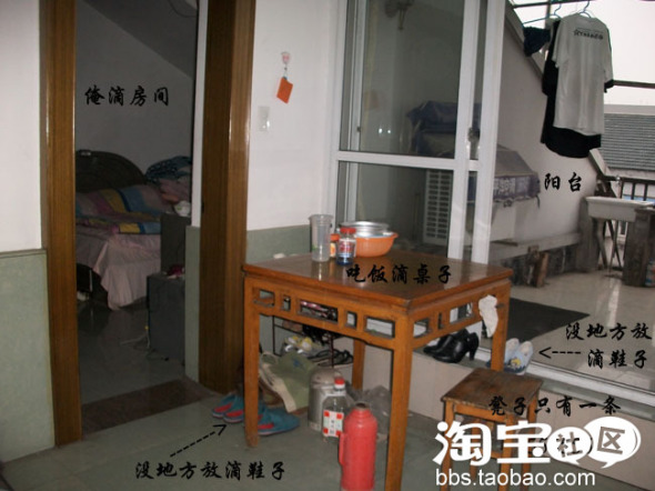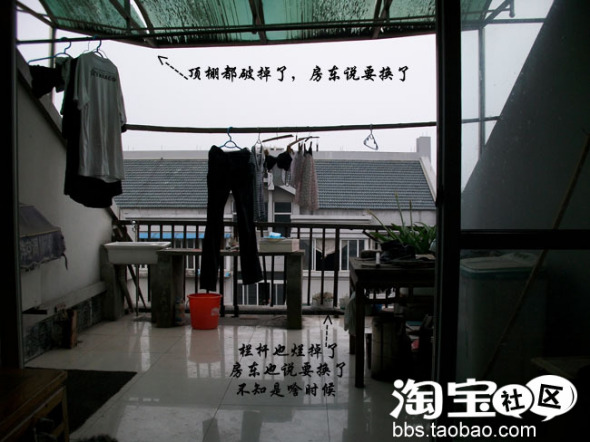 阳台的顶棚破了,所以下雨天漏水,衣服就没地方晾了...