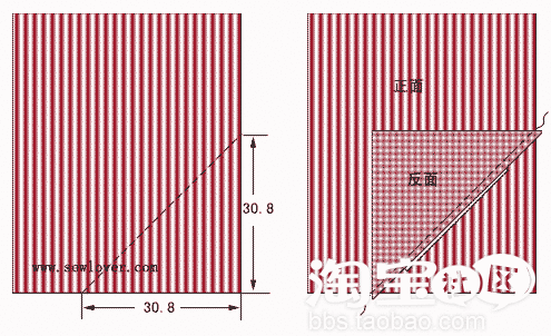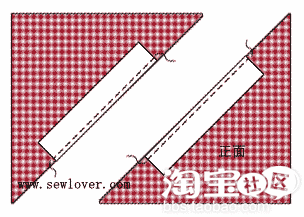 4. 在一块条纹布的正面右下角如下图所示划一条斜线,然后以这条线将做为缝合线和格子布缝合: