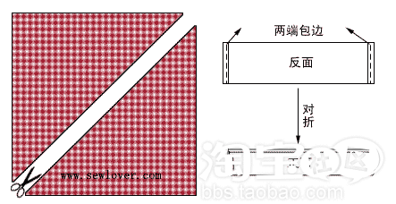 1. 将正方形格子布按对角线裁成两个三角形;将两条7×26厘米的白布两端包边,然后对折: