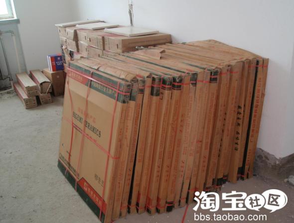 这就是我买回来的砖了,看工人帮我摆的还算整齐吧!说说我买地砖的小窍门吧,因为我们家是一楼,所以我和商家谈合作,就是我的家可以当样板间帮他们做宣传,然后让老板在价位上给我便宜,而且还送我花片,最后连运费和搬运费都送了,呵呵,(一般送砖的都只送到单元门口,要自己找人花钱往屋里送的哦)好了就不显摆了哦!等铺好了,给大家上PP吧!