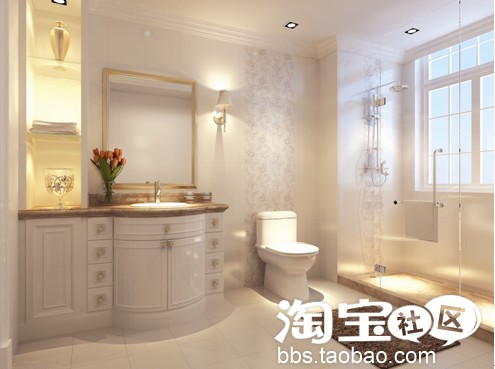 浴室吊顶可以根据不同造型,选用多种材料,如平顶可以用PVC扣板、铝扣板、塑铝板,配以轻钢龙骨。一般吊顶高度可设计在2.2米~2.4米之间。在面积超过8平方米时,不妨在洗面盆上方安装化妆品柜,离水源较远处挂置储衣箱,或划出一块地方做日常更衣之用。湿度较高的环境也要求浴室里的家具经得住考验,一定要选择防水防潮等级高的板材。