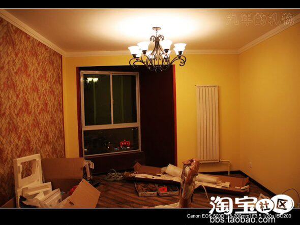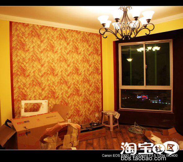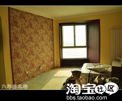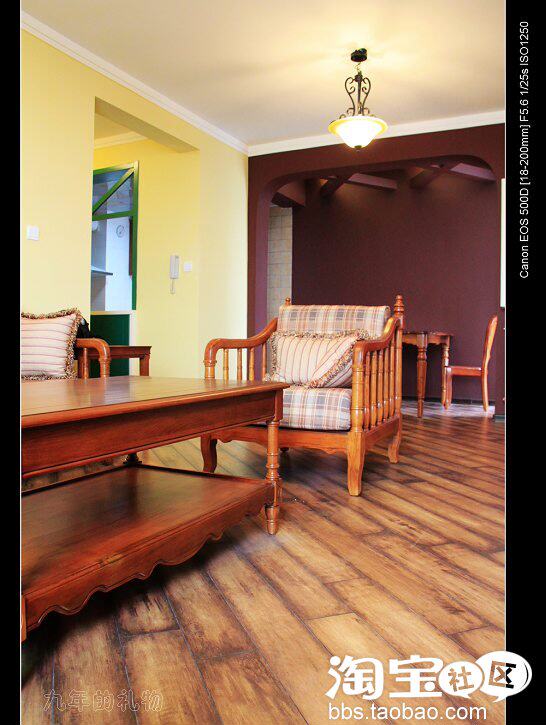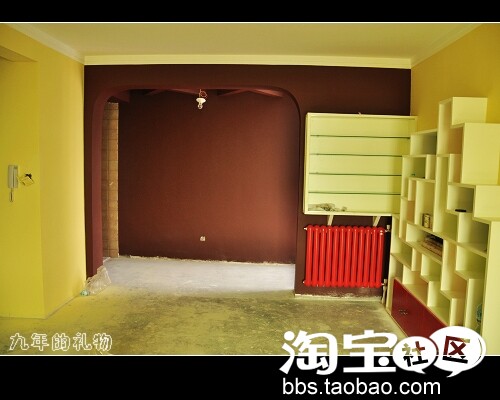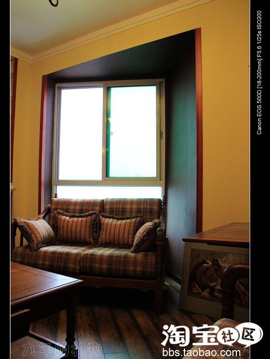 客厅墙面是黄色的 三角小区用剩余的巧克力色涂刷的 巧克力色的漆比较贵 两小桶就300多块钱 不舍得浪费啊 呵呵 影视墙比较简单 选择了符合风格的壁纸一贴就完事了 旁边用木线条压边 这样做一是因为屋子面积小 不适合有太大的动作 另外还可以省钱 目的达到了又比较实用~ 屋子最后还是给自己住不是光给别人看的 作为以后的小主妇 我得为自己打扫考虑啊~~ 那多宝格就不好打扫 哎谁让那是家里的亮点呢 忍了