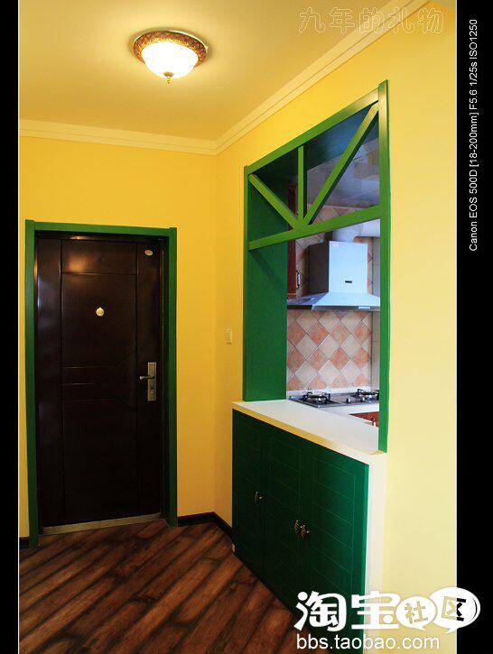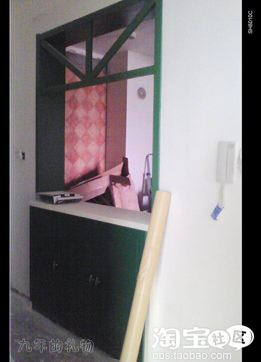这是进门的鞋柜和隔断,鞋柜是做的当天我现场计算设计的,外面还有柜门;上面的隔断本来想做成格子状再加玻璃,后来因为玻璃不好加,我和男友临时改成了半个“米”字状的。至于以后油烟问题,呵呵到时候再说吧