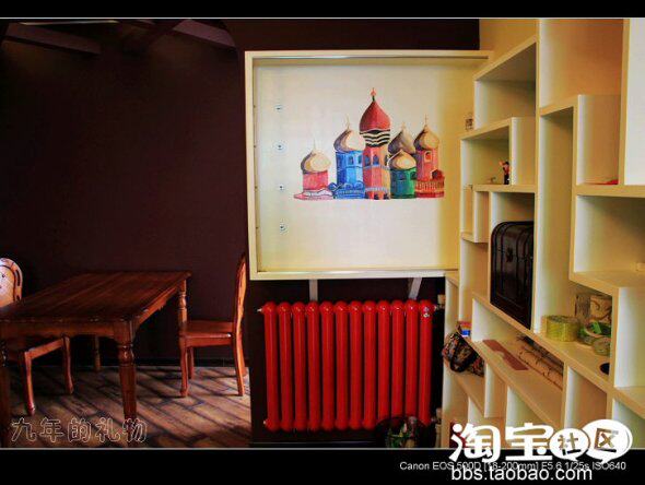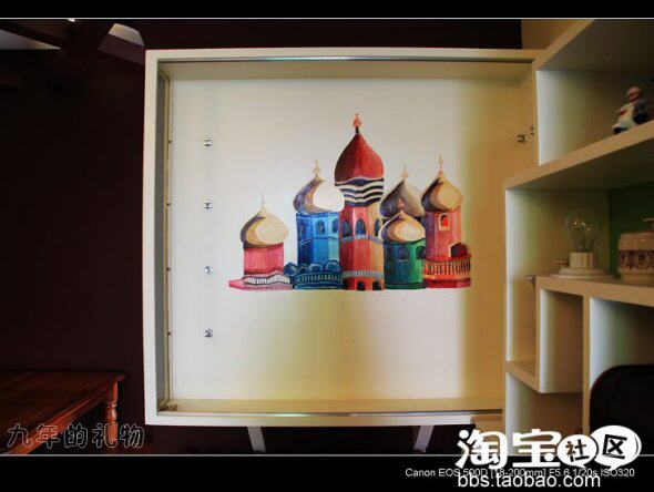 展示柜手绘的俄罗斯小城堡~ 配合俄罗斯夺多宝格,装修到这一步的时候 家人都说很像儿童乐园哈啊哈,我喜欢!弄的这么五颜六色其实是为了中和地板和家具的颜色,一开始说过了,我们的家具是英式的,那个颜色比较深中和一下,不会显得那么老气,心情也会好些~