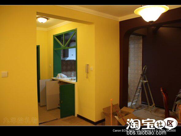 木工活结束后,就是油工上色,以及墙面的粉刷了。我们选的是不需要添加基漆的最深的黄色,以及巧克力色,一是用颜色做了餐厅和客厅的分区,另外就是中和一下屋子里的各种颜色~