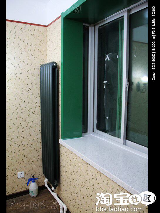 绿窗框是为了配合家里整体的色彩 窗台面是普通人造石的 暖气是后来更换的 墨绿色磨砂暖气 光线的原因有点发黑