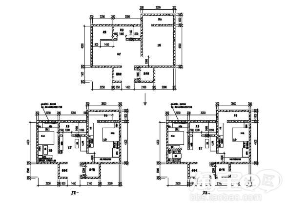 4、我自己设置了两种方案,但是我不太清楚具体家具的大概尺寸,或者说是规范的要求。请大家帮忙看下,那个方案好。大概的造价多少。我也想找个兼职的设计师帮忙设计下,在北京,费用不会太高