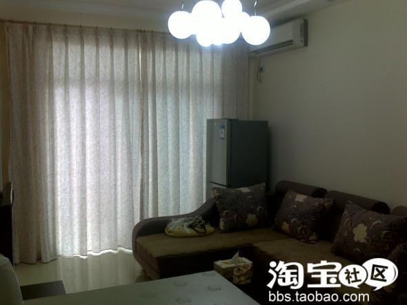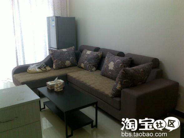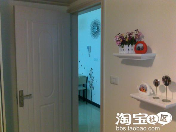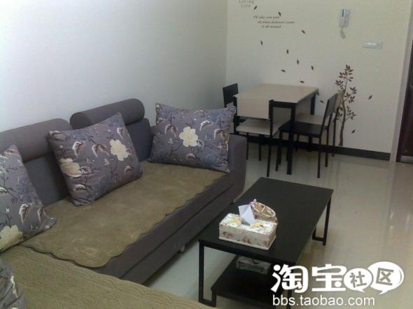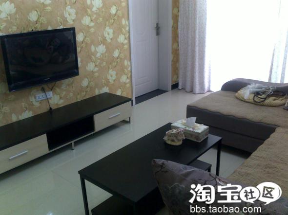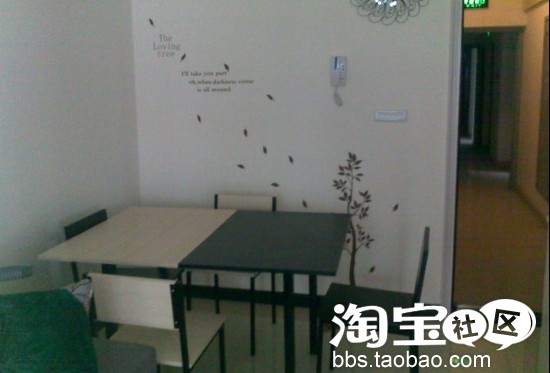 餐桌和茶几还有电视柜都是一套的,墙上的是我自己贴的墙贴,花了我一下午的时间,不过完成后很有成就感啊,哈哈,当然也是淘宝买的。