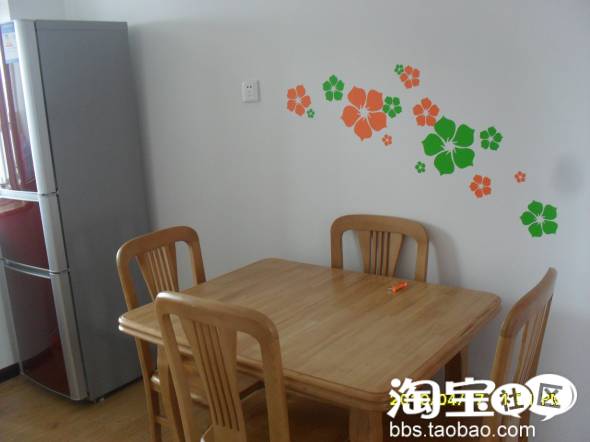 餐桌边,我家餐厅太窄餐桌只能靠墙放了,两个人吃饭够了,餐桌挨着白墙挺单调的,买来两套花放上面了,橙色可以增加食欲,绿色看着舒服,两套搭配这来的,贴完发现斜度有点大了,只能这样了