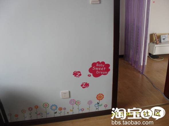 次卧的墙上,这个屋子以后肯定是要作为宝宝房的,弄点卡通点的,地板上贴几个小脚丫,可爱喜欢