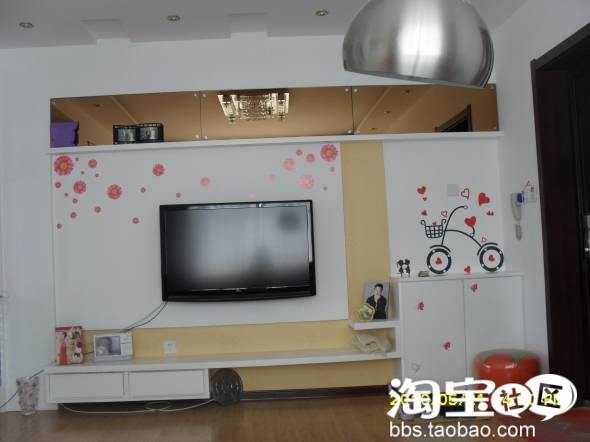电视墙上贴的,电视上面是几朵花,鞋柜上的单车,象征我们的爱情,呵呵