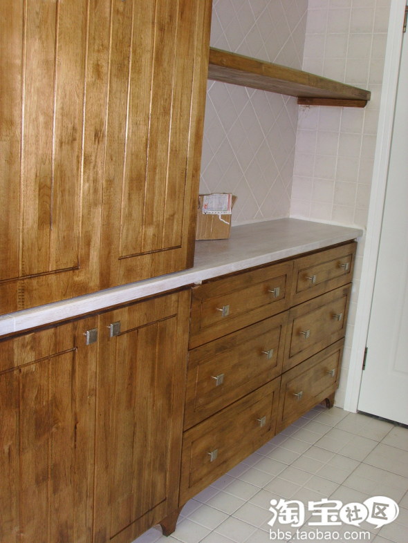 新鲜出炉的厨房,上图啦!厨房终于彻底弄好了,今天木工师傅过来把上了蜡的门板和拉手都装上了,真的太棒了,比起三四千一米地柜的实木定制厨房,无以伦比的性价比啊,还多了点乡村的味道,而且连台面都是橡木的(台面做了白色蜡)!