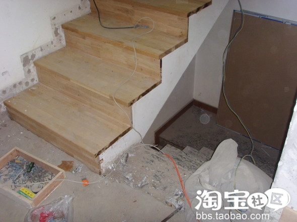 上了仿古橡木色木蜡油的楼梯(边上的踢脚线还没做,要上白色)。