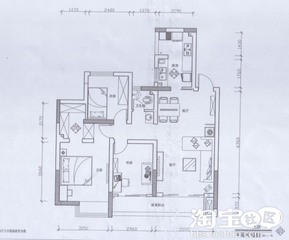套内74.15的面积,怎么会有三室两厅双卫,这得归功于开发商的赠送,大家在上图看见的L型阳台,只算半面积的,所以可以弄个小书房,也算是三室了,书房的面积比儿童房还大1个平方,这点有点点遗憾,通风和采光都不错,厨房比较“畸形”,这点我一直耿耿于怀。下面是初步的设计图: