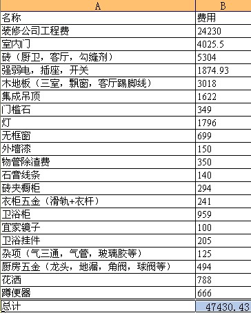 【实际消费】:以下是到目前为止的消费,就剩下洗衣槽、橱柜(砖夹)和很少部分的工程款没有给装修公司了。除没有包括车费外,所有费用没有遗漏。