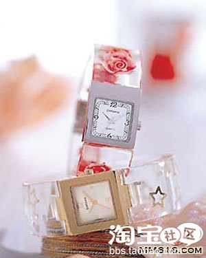 搭配亮点:透明玫瑰星星表。据说是采用离子分离技术将玫瑰和星星图案雕刻进表带里,看看,够新新人类吧,虽然有着高科技的味道,这款表依然散发出天然而纯洁的味道,玲珑精致得让人爱不释手哦!