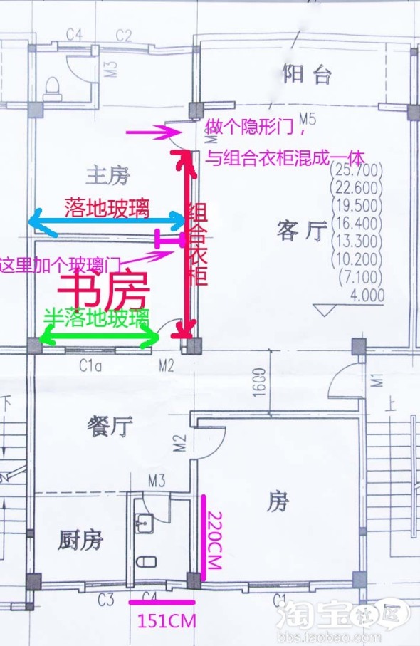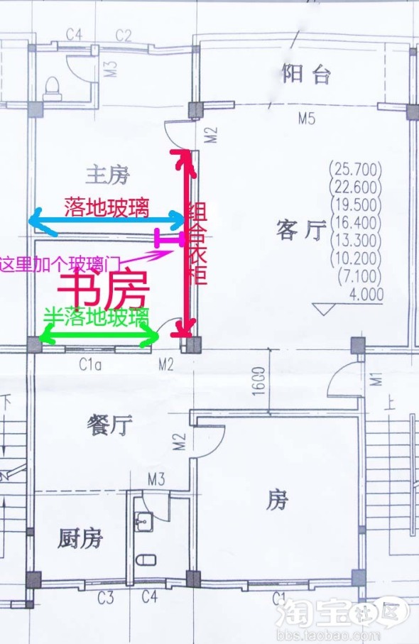 如果做客房的话,主卧与客房连通,不是太好。7楼的朋友,玻璃门可以加上锁,做书房时可以打开,这样比较通风,做客房时锁上,主房原来的门做成隐形门,觉得怎么样?