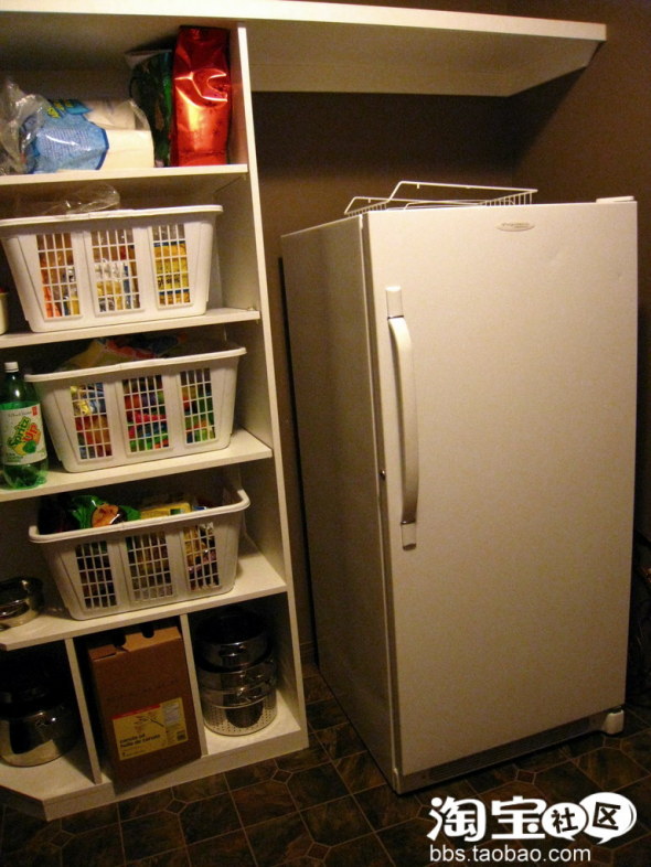 有个冰柜。储物室很乱,这还是已经整理过了的,