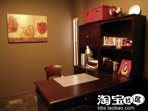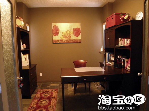 书房,对着洗手间,哈,老公是个金融家,平时很稳重,我猜是怕搞错数字吧,所以他希望的书房也端庄,古朴、典雅点