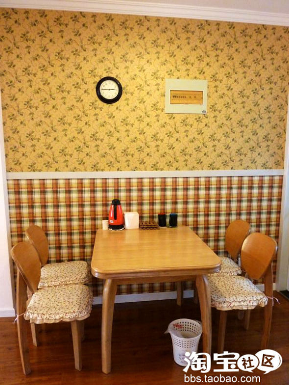 餐厅的墙纸是vivi 的大爱,反复拍的地方,都是我比较满意的地方~~~啊哈哈。墙纸来自淘宝,找当地墙纸师傅给贴的,贴完的那天就后悔了,后悔墙纸设计少了,应该都贴上才好。