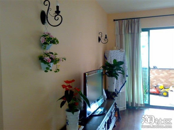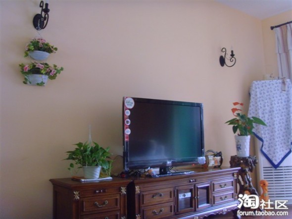 侧面电视柜,电视当时是37寸的,没想到只看了1周就出了问题,还是LG的,很是郁闷,花了5800,居然只看了这么几天就坏了。LG还不想给我们换,后来老公据理力争他们没有办法才同意,因为这款已经没有货了,加了钱换成了42寸的。TXM买这个牌子要慎重啦。(电视柜、壁灯、窗帘、装饰花来自淘宝,特别说一下窗帘,和单人沙发一样的布料,专门在淘宝上面找到的,我家所有的窗帘含运费只花了1400左右,比在当地便宜多了去了,我的同事很多人窗帘都花了大几千还有上万的~大家装修想省钱的话,可以在这一项上下点功夫)