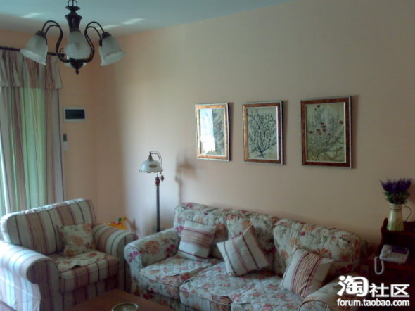 最近拍的客厅,光线不太好,有点黑,3副画已经挂好了,也是来自淘宝,很喜欢.(百家的吊灯经典实用)