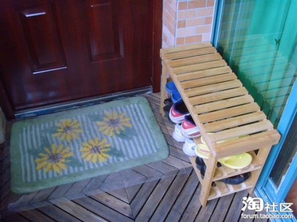 门口(换鞋凳、软玻璃垫、防腐木地板来自淘宝,换鞋凳是我亲手组装的,很有成就感哦。软玻璃这种用法是跟我姐姐学的,值得推广,脏了用湿抹布一擦就可以了,很简单。防腐木地板用在室内在本地也是少见的,我在网上看到之后给老公看,他挺喜欢,让我买,我后来说算了,用瓷砖,人家还不同意,呵呵,还是坚持,那就用吧,我自己也是挺喜欢的。也是淘宝买的,和花盆架、花盆等东西在一家买的。)