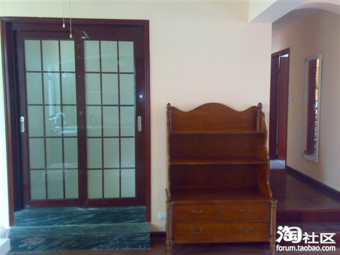 餐边桌淘宝买的,实木的,价格是1800左右,旁边这个门是客卫,为了做出衣帽间我自己改了原本的结构,卫生间门本来是在衣帽间那里的,我把卫生间隔了一半然后 又往餐厅挪了20厘米左右,牺牲了一点餐厅的面积,但是我有一个梦寐以求的衣帽间,开心~~呵呵,这样我的主卧不用做一大排的柜子,空间大多了。