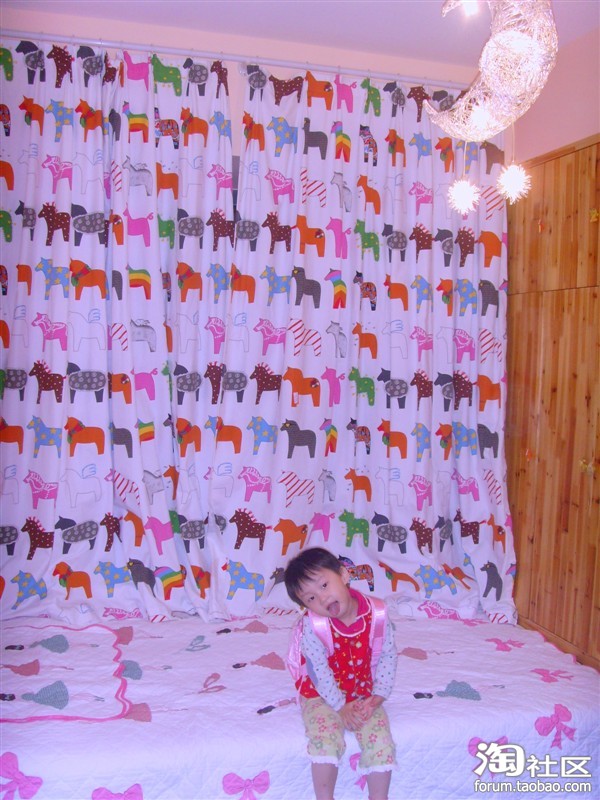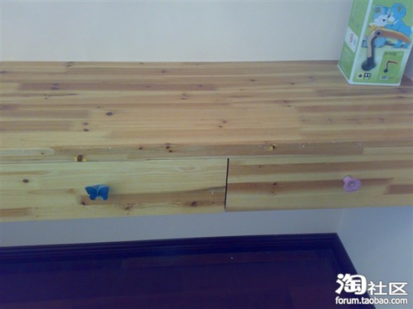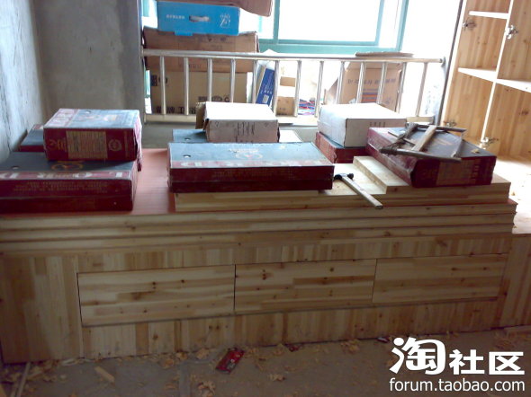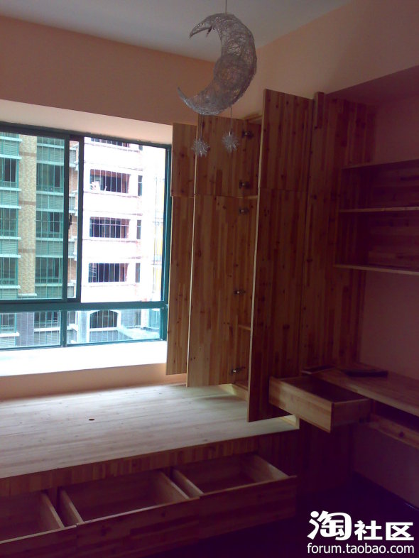 做了一个比较高的地台。有抽屉,中间也可以拉开放东西。(灯具淘宝买的,淘宝卖的很热的一款灯,貌似我没有买到最便宜的,呵呵。彩色小马窗帘也是淘宝买的,孩子很喜欢月亮星星灯和小马窗帘)