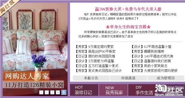 在淘宝网消费者社区的家居装修板块,一个题为《11万实现126平方米美式田园混搭梦》的帖子被管理员加精。图文并茂的帖子显示,楼主家的装修,从吊顶、床、床垫、妆台、沙发、灯饰、电视柜,到穿衣镜、水槽、龙头、挂饰、挂钩、开关、柜门拉手、调味瓶……全部来自网购,让人惊叹。许多网友纷纷跟帖支持;也有不少网友直接留下自己的邮箱地址,索要网购清单;还有网友直接留言:“以后装修,把你的作为标准了,希望楼主许可。”跟帖数多达6页、百余楼。