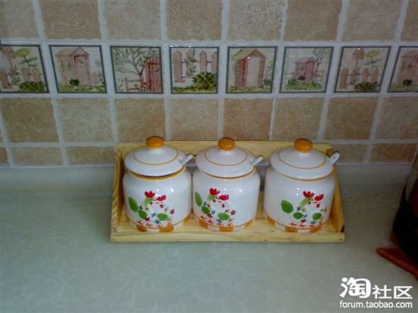 美貌的调味瓶(来自淘宝,39.9元),乡村味道十分的罐罐,和我家的瓷砖非常搭,当时选的时候卖家店里有好几种图案,纠结很久不知道改选哪个好,恨不得都买回来算了,呵呵~~后来决定还是买公鸡更符合我家的装修风格,还好选对了,很喜欢~~