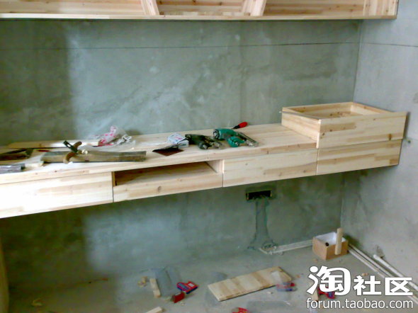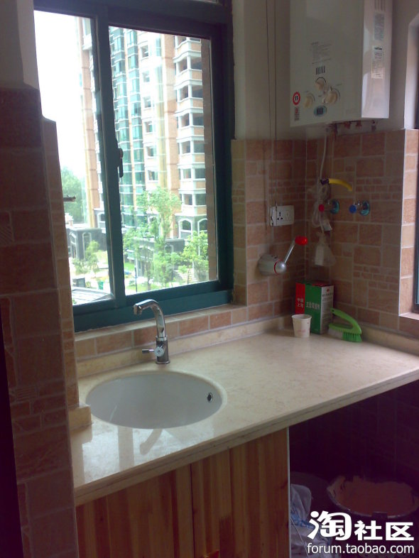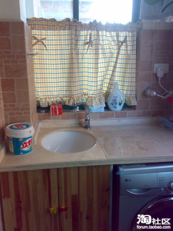乱哄哄的洗衣台,这个地方我个人认为利用的比较合理。下面是洗衣机,还有水盆可以洗小衣服。(小窗帘、水龙头、挂钩、好太太晾衣架来自淘宝,这个晾衣架买了之后我发现工人都不会装,只能请当地专卖店装,居然要50大元,算下来和网购差不多,当地的专卖店老板还挺拽的,说你们在网上买不如在当地买我们还有售后,你们这坏了我上门修一下只好20元。不过呢,我还买了梯子和折叠晾衣架,算下来还是划算的,呵呵~~)