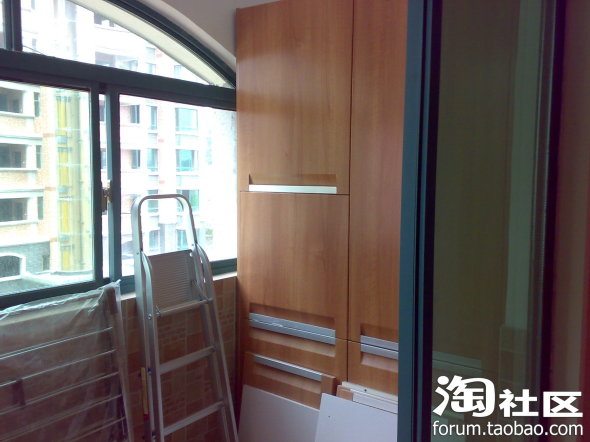 阳台的高橱柜,旁边是网购的好太太梯子和晾衣架
