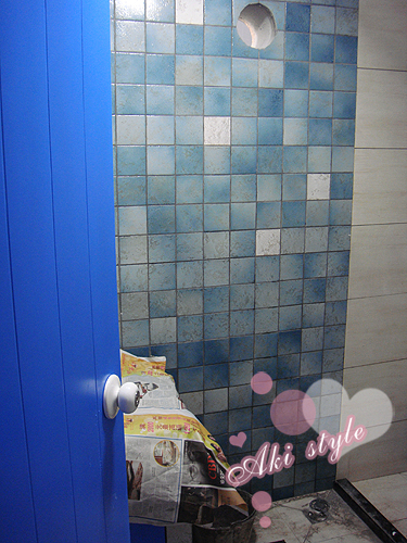 因为瓷砖的设计师说..我们家长方形的洗手间..如果按照我保守的蓝白相间斜铺..会比较小气..会比较压抑..
