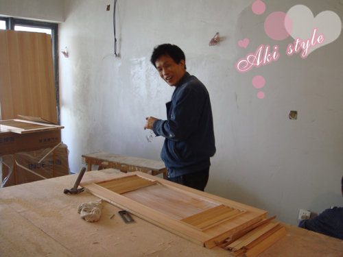 因为本来橱柜要做有木纹的..不过碍于之前和工头没沟通好..他选用的木材上漆后没办法留下自然地木纹..