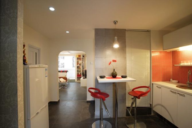考虑到此案的实用性,在整体色彩搭配中,设计师运用了红色作为点缀色出现,使整个冷酷的空间里萌发了生机。白色的家具与白色的墙面融为一体,使本来狭小的空间因整齐而显得宽敞。
