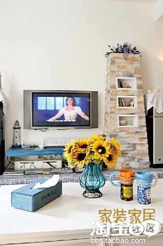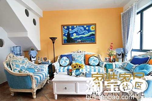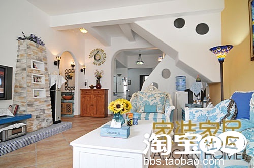 ”南普罗旺斯向北“,这就是家的主题。完成之后我和老公看着家里粉蓝的一切,得意到不行。我的梦幻地中海终于打造完成!盛夏,炎炎烈日却侵袭不了我们一室清凉的蓝白天地,无限舒适地躺在沙发上看电影是我和老公最享受的生活。家里全部的床品,床幔都出自于淘宝。装饰品和公仔都大部分在淘宝上淘来的。还有一些镜子,洗脸盆都是出自于淘宝。