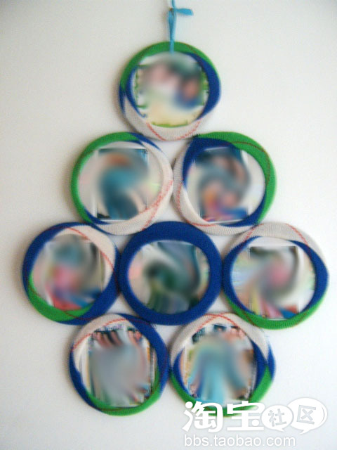 光盘边是到小市场买的长筒袜子,剪裁成一段一段的真接套上去就行了,背面每个光盘连接处缝合上就完成了,如果家里有不穿的紧身衣毛衣类的衣服,可直接用袖子做。这样就真是作到废物利用了啊,呵呵!最后这张图,如果下面在放一个光盘,边都用红色的袜子套上去,那下边再放一个小穗穗,就如中国结一样了,如果家里没有光盘可以用纸箱做的。