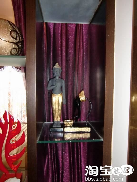 这是落地灯和带有新古典的中式角几。在上面放了个泰国的佛像还烛台,像是拜神似的,呵呵。