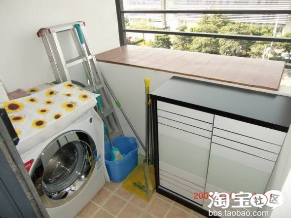 这是书房对出的小阳台,刚好摆放洗衣机和鞋柜,和晾衣服。