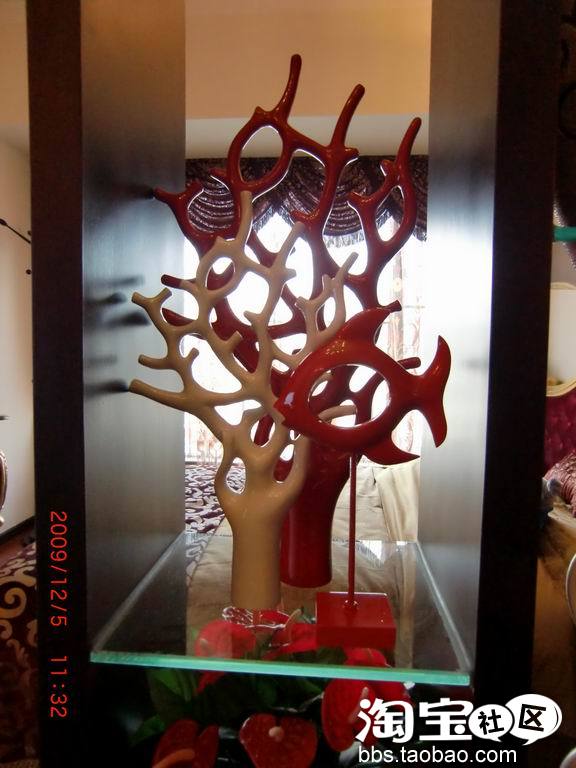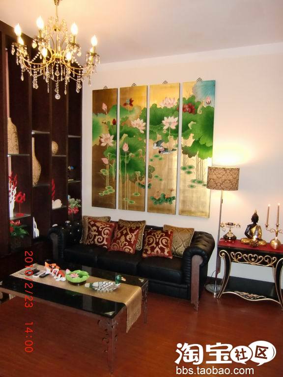 茶几上还放了个荷花容器和两条锦鲤,刚好与墙上的金箔荷花漆画相映成趣.